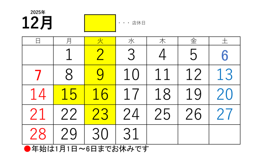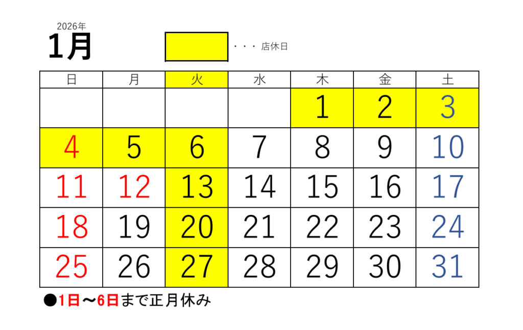 ●年始は1日~6日までお休みをいただきます。